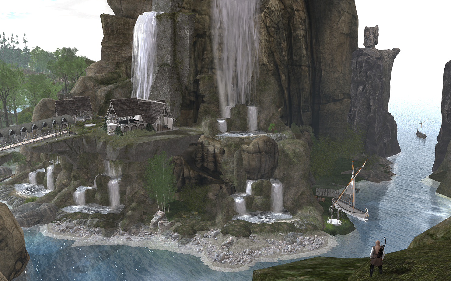 You will land at the edge of WesLorien woods, where the ancient Elven Tree houses are found near the largest waterfall of the region. The tree houses are furnished but empty, waiting for the Lorien Elves to resume their residence.