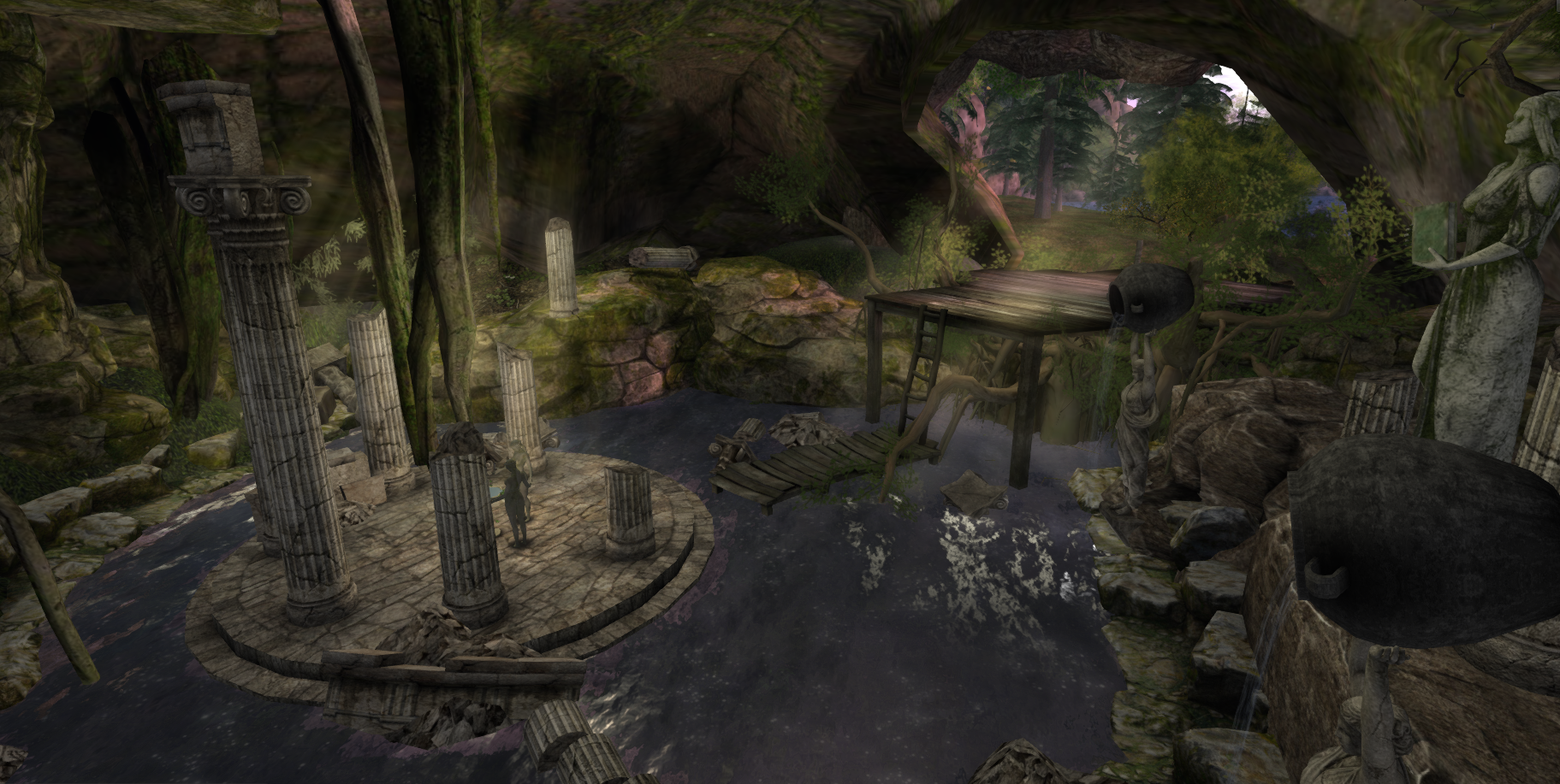 When you climb the stairs – or sit on the teleporter tree stump at the bottom of the tree house – you can overlook the compartments of the waterfall. If you focus well, you might find the throne of where the elven councel used to be held high up, where the waterfall splits. Only handy elves are agile enough to climb the trees and swiftly reach the councel area.